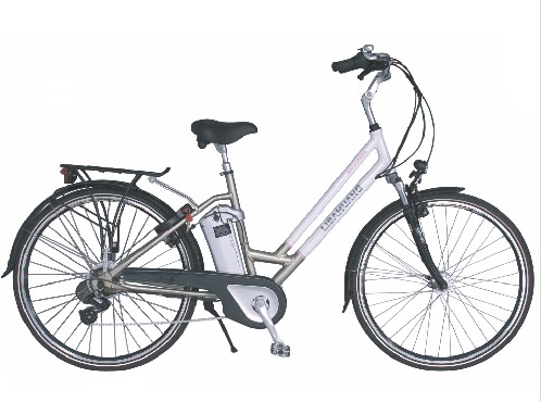 This electric bicycle has a step-through frame for easy access. It is equipped with fenders, a rear rack, and lights, making it suitable for urban commuting.